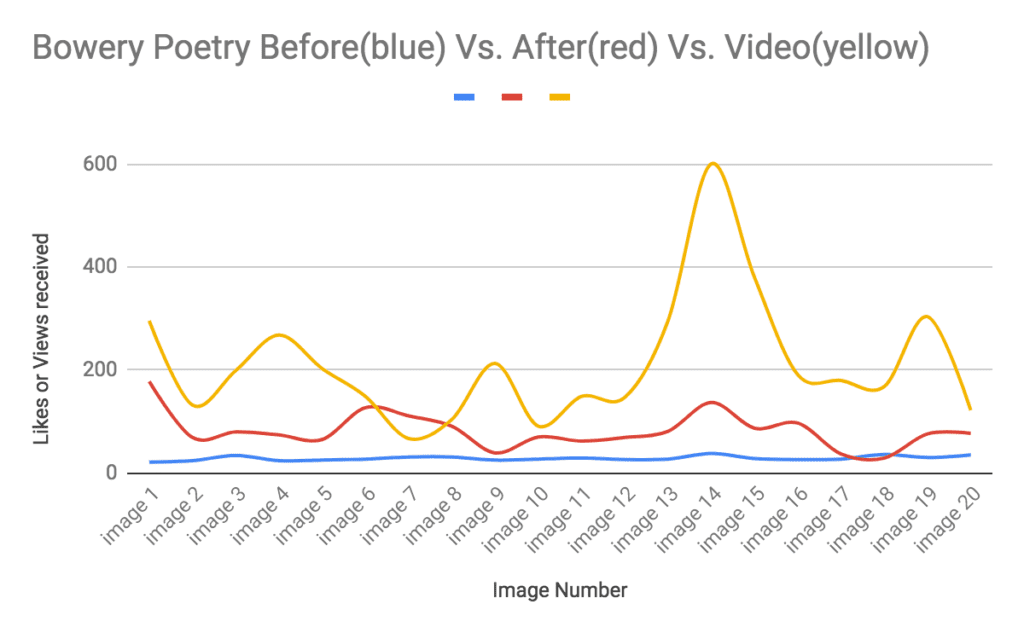 This graph shows how the Bowery Poetry posts were doing before I took over the social media account (blue) and what happened after (red). As you can see, there was an immediate increase in engagement from the very first post. The videos also did well. One video got about 600 views which I believe might have been a result of the poet self-promoting on their personal account.